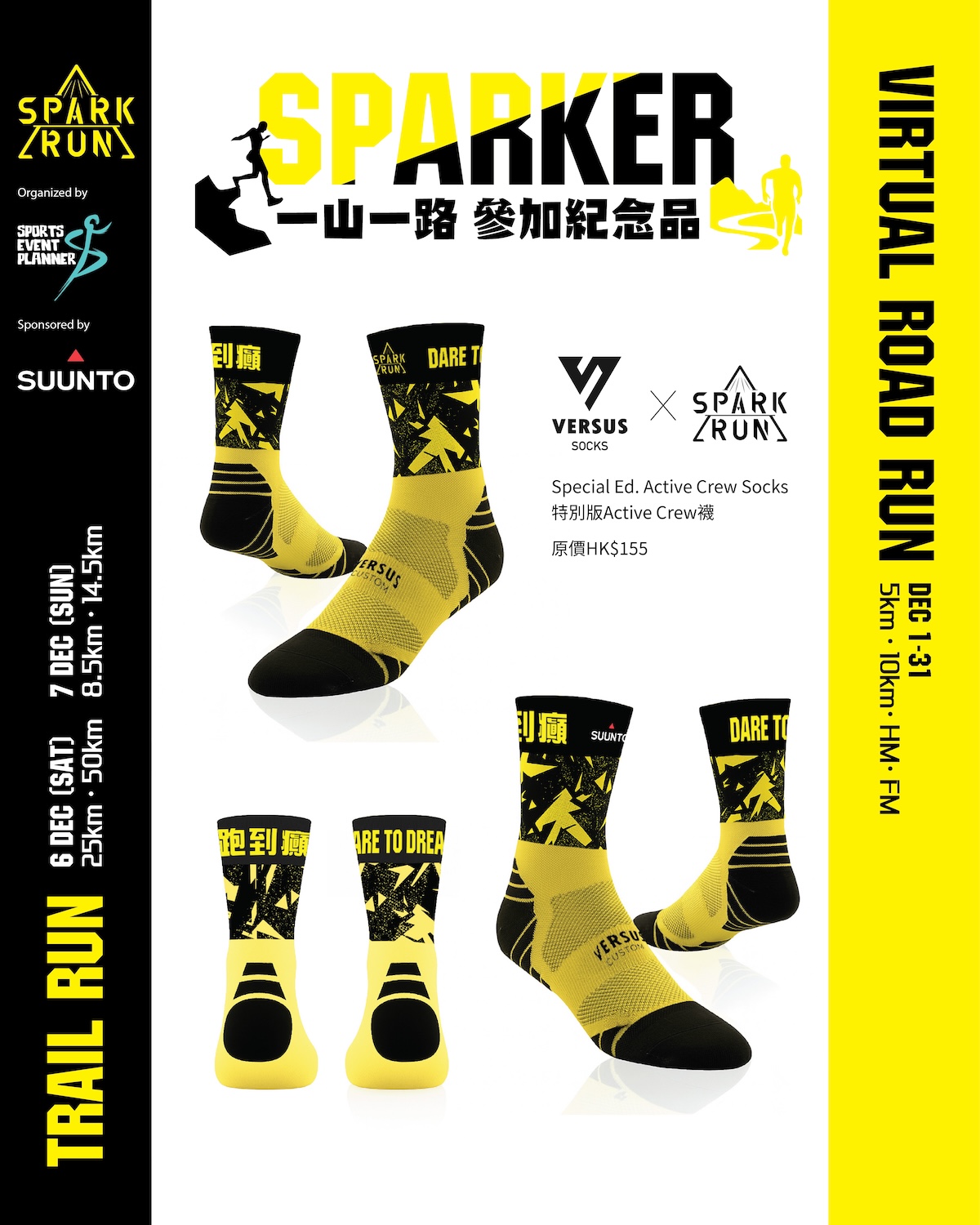 現報名資格:凡報名參加任何一項或以上的越野跑,加上任何一項或以上的虛擬路跑,即可成為「SPARKER」並獲得「Versus X SUUNTO SPARK RUN特別版Active Crew襪」一對。
